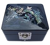 Silver J SJJB01, This is a small wooden jewellery box with beautiful mother of pearl inlaid on top of the jewellery box in the pattern of cherry blossom, birds with dark blue background, and has lacquer finish for glossy surface as well as protection of mother of pearl craft. This small jewellery box can be used to store jewellery or trinkets. Also it has a mirror under the lid and smooth red felt lined in the box to protect the jewellery box from scratch. Sweet tortoise pull attached to the wooden jewellery box lid for easy opening. Size : Width 10cm (4") X Depth 8.5cm (3.5") X Height 6cm (2.5") ...