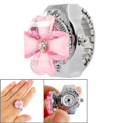 Como , Please measure your finger size to make sure this item fit before ordering.Features clover shape plastic crystal hunter case, round dial, has 3-hand, hour, minute and second, 12 Arabic number, stretch band.A knob at the right side for adjust the time, finger ring design made it more convenient to read time.
